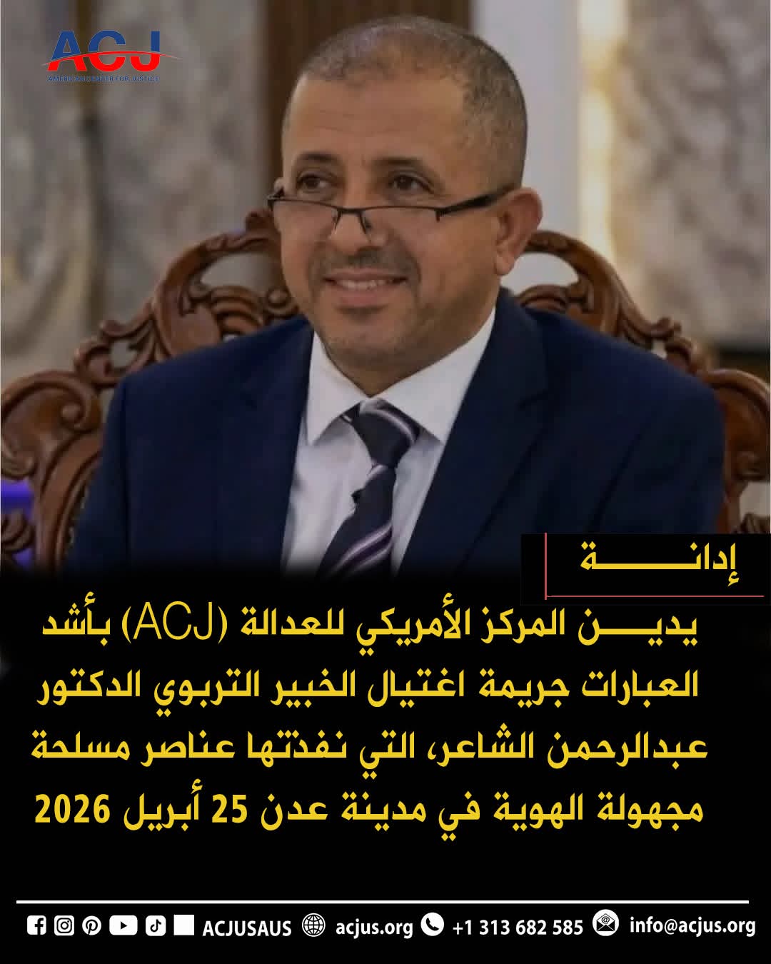 أدان جريمة اغتيال الخبير التربوي”الشاعر”.. المركز الأمريكي للعدالة: عودة مسلسل الاغتيالات إلى عدن مرتبط بالتساهل مع الجرائم السابقة