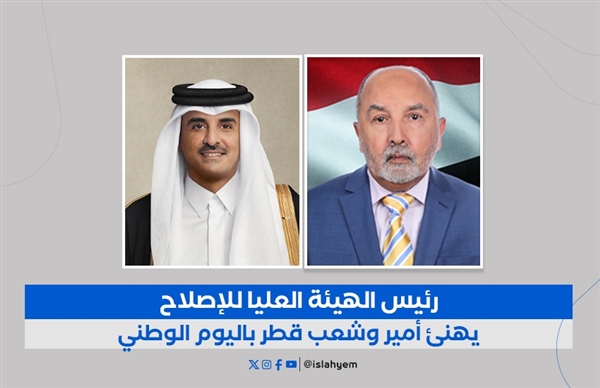 يطيب لي، ونيابةً عن قيادات التجمع اليمني للإصلاح، أن نبعث إلى سموكم بأسمى التهاني والتبريكات بمناسبة اليوم الوطني لدولة قطر الشقيقة.